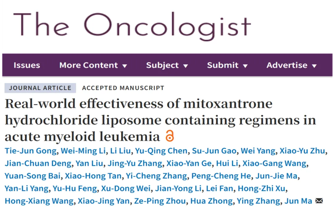 近期, 一項(xiàng)由哈爾濱血液病腫瘤研究所馬軍教授牽頭開(kāi)展的,鹽酸米托蒽醌脂質(zhì)體注射液治療急性髓系白血?。ˋML)的全國(guó)多中心、真實(shí)世界研究結(jié)果于《The Oncologist》雜志正式發(fā)表,該數(shù)據(jù)首次披露了真實(shí)世界中米托蒽醌脂質(zhì)體在AML患者的療效以及安全性,為其在白血病的應(yīng)用提供更多循證證據(jù)。