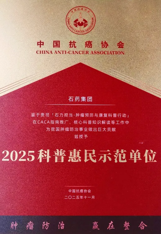 石藥集團榮獲中國抗癌協(xié)會“2025年科普惠民示范單位”