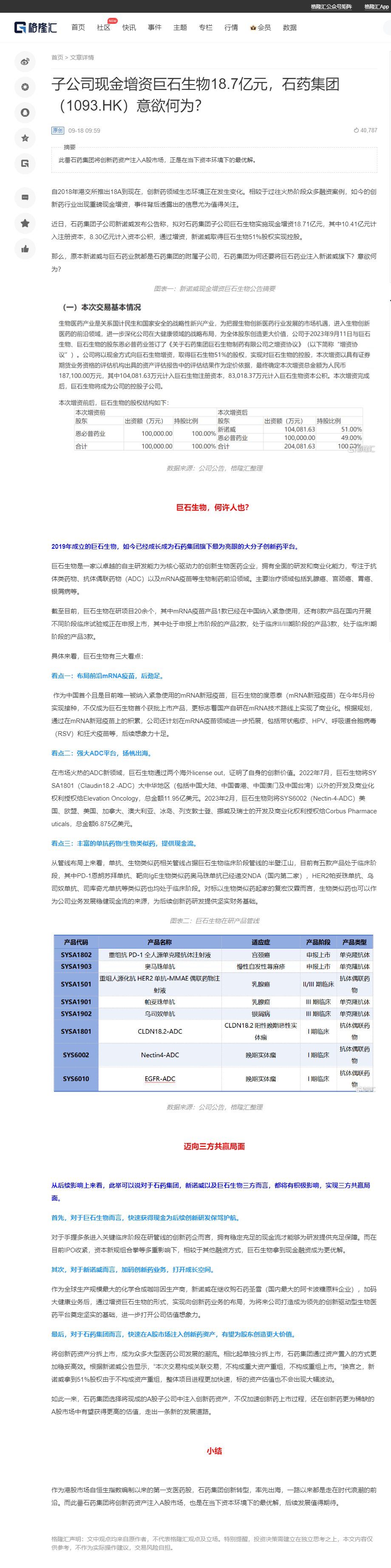 子公司現(xiàn)金增資巨石生物18.7億元,石藥集團(1093.HK)意欲何為?