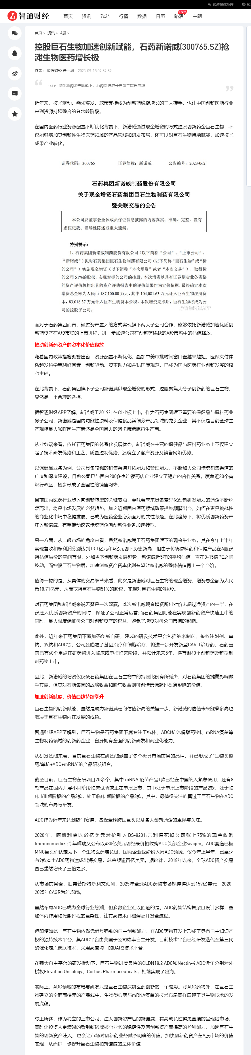 控股巨石生物加速創(chuàng)新賦能,石藥新諾威(300765.SZ)搶灘生物醫(yī)藥增長極