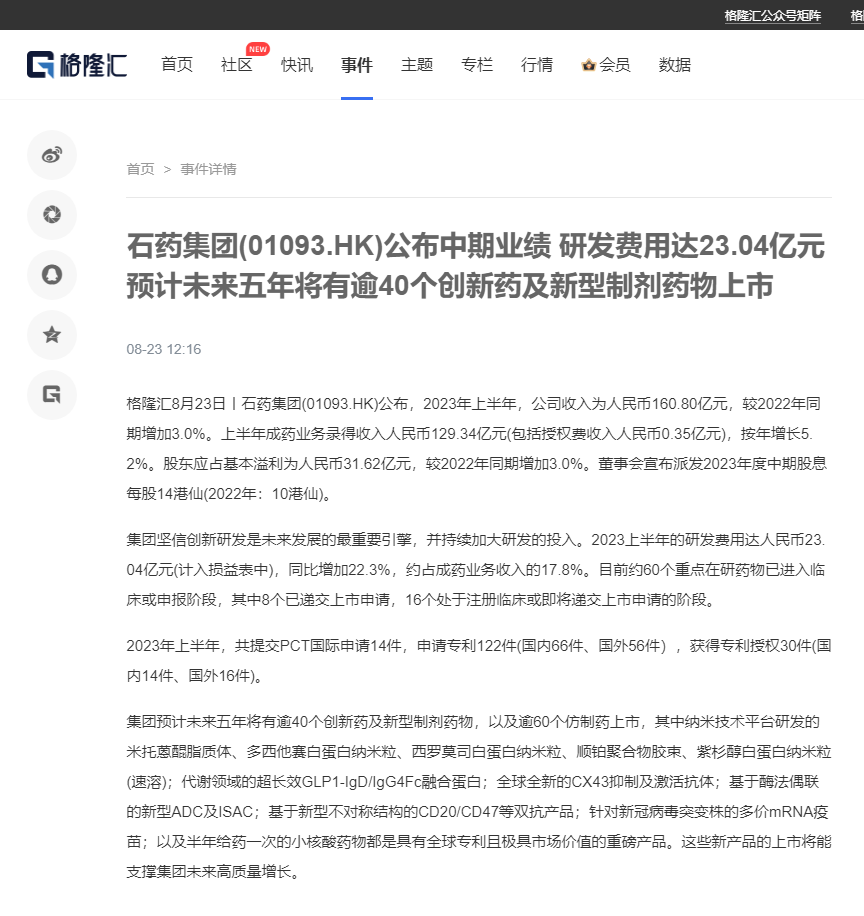 石藥集團(01093.HK)公布中期業(yè)績 研發(fā)費用達23.04億元 預計未來五年將有逾40個創(chuàng)新藥及新型制劑藥物上市