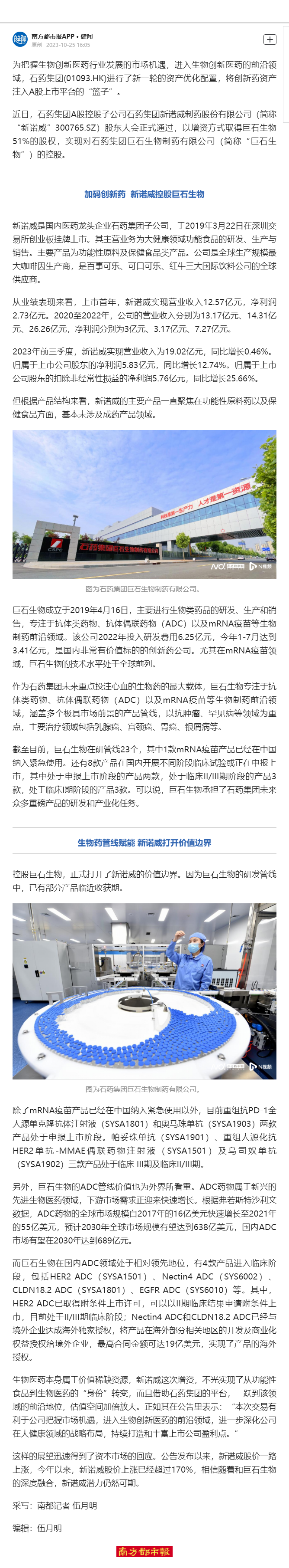 近日,石藥集團(tuán)A股控股子公司石藥集團(tuán)新諾威制藥股份有限公司(簡稱“新諾威”300765.SZ)股東大會正式通過,以增資方式取得巨石生物51%的股權(quán),實(shí)現(xiàn)對石藥集團(tuán)巨石生物制藥有限公司(簡稱“巨石生物”)的控股。
